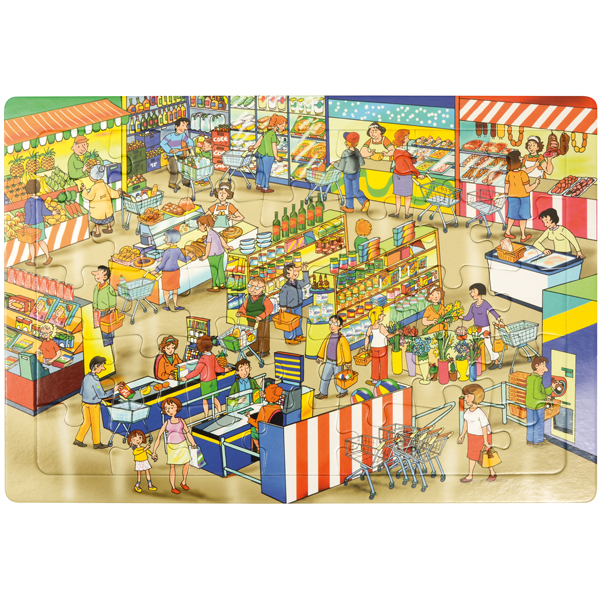 ... Auf 35 Puzzleteilen gibt es alles, was das Herz begehrt und in den Einkaufswagen passt: Obst & Gemüse, Fleisch & Wurst, Pizza & Backwaren, Konserven, Getränke, Blumen, Illustrierte. Jetzt aber schnell an die Kasse!