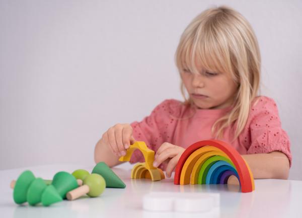 Diese Spielwelt Regenbogen begeistert alle Baumeister, Eisenbahner und Feenwelten-Träumer. Es besteht aus 5 Bäumen, 2 Büschen, einer Wolke, einer 5-teiligen Sonne und einem 8-teiligen Regenbogen. Das Set ist wunderbar zum Spielen und Bauen in der Bauecke, als Ergänzung z.B. zu Holzeisenbahn und Straßenset und passt super in märchenhafte Spielwelten mit Zwergen und Elfen.