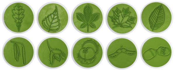 Eiche, Kastanie, Buche, Ahorn und Birke sowie 5 Stempel mit den dazu passenden