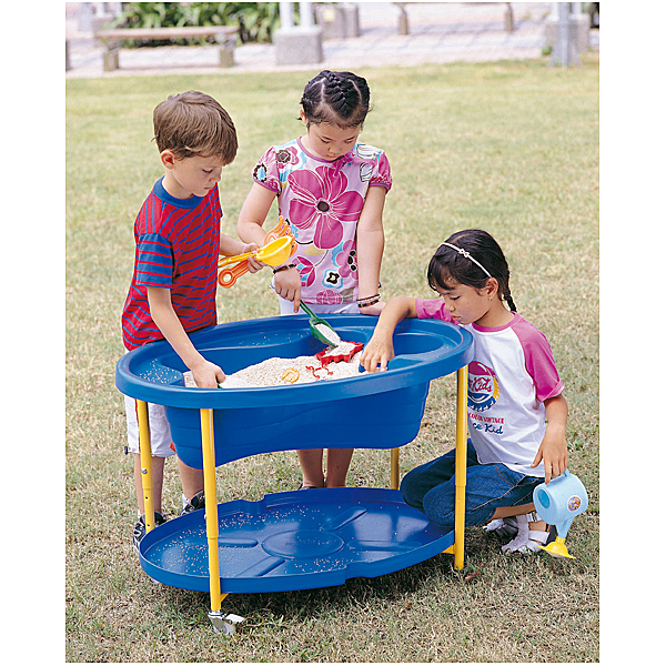 Für Sand, Wasser und Erde. So werden taktile Erfahrungen auch im Raum ermöglicht. Die Kinder können nach Belieben Sandburgen bauen, Kugeln kneten oder Kuchen backen. Die höhenverstellbare (44-58cm) blaue Kunststoffwanne besitzt einen Ablaufstopfen für Wasser. Der Deckel kann zum Abdecken oder als Ablageboden einsetzt werden. Das aus Stahlrohr, pulverbeschichtet Gestell hat zwei Rollen zum leichten Transport.