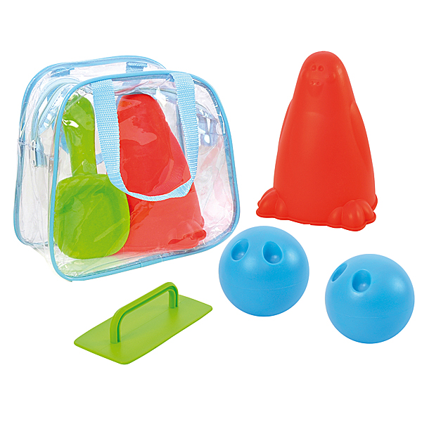 Mit diesem Set haben Sie alles für die Sandbowling-Bahn: Mit Hilfe des Schäufelchens werden die Seehundformen mit Sand gefüllt und als Sandkegel aufgestellt. Die Kelle sorgt für eine ebene Spielfläche. Die Kugeln werden mit Sand oder Wasser gefüllt los geht der Kegelspaß. Inhalt: 6 Teile.