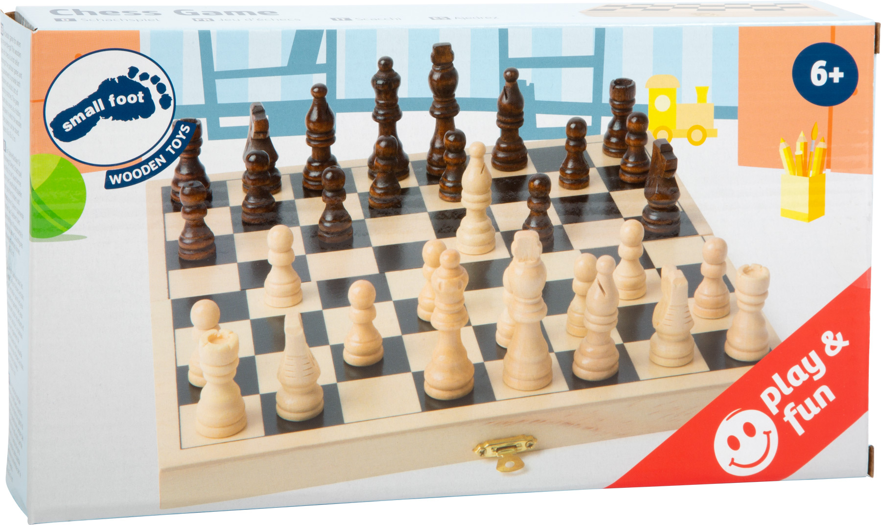 Dieses Schachspiel ist aus Holz, wobei das Spielbrett gleichzeitig als Klappkassette dient, in der die hölzernen Schachfiguren aufbewahrt werden können.
