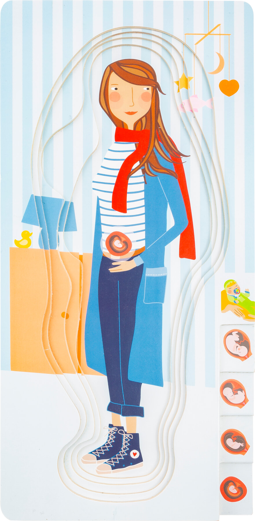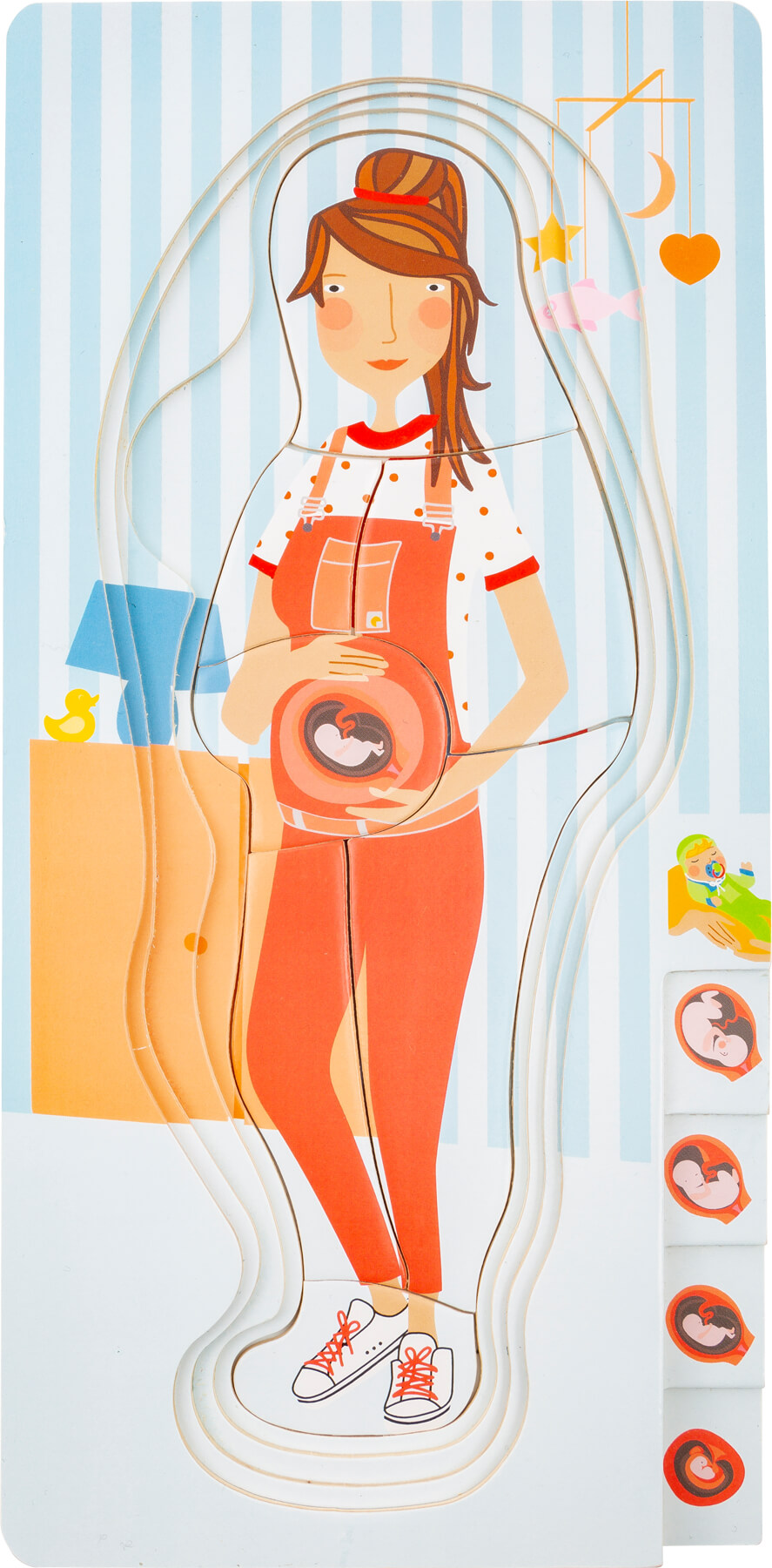 Die verschiedenen Schichten des Lagenpuzzles werden durch die Bilder des wachsenden Babys im Bauch am rechten Puzzlerand verdeutlicht. Ein lehrreiches Puzzle, das Spaß macht!
