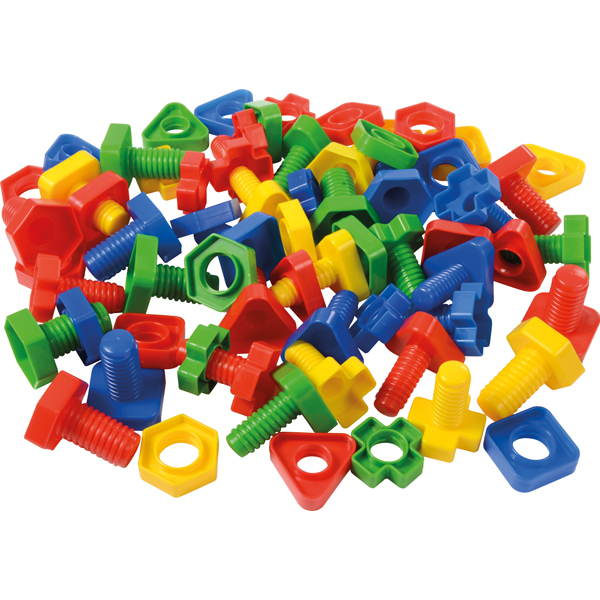Formen erkennen und verbinden... Es gibt dreieckige, viereckige, sechseckige und kreuzförmige Schrauben und Muttern - nur gleichförmige Schrauben und Muttern lassen sich verbinden, da die Gewinde verschiedene Durchmesser haben. Die Farbe ist dabei nicht relevant. Das Spielen mit dem Schraubenset fördert die Wahrnehmung, Feinmotorik und Auge-Hand-Koordination. Inkl. praktischer Aufbewahrungsbox.