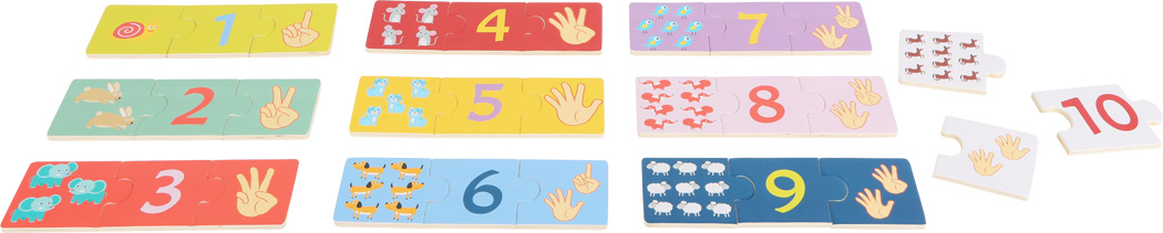 Dieses tolle Legespiel hilft Kindern die Welt der Zahlen spielerisch näher zu bringen. So entwickelt sich systematisch ein Mengenverständnis. Jede Zahl wird grafisch, als Abzählbild mit Fingern und als Anzählbild anhand von Tieren dargestellt. Der Zahlenraum von 1 - 10 kann so erkundet werden. Die einzelnen Teile sind aus Holz und bieten somit eine Langlebigkeit des Spiels.