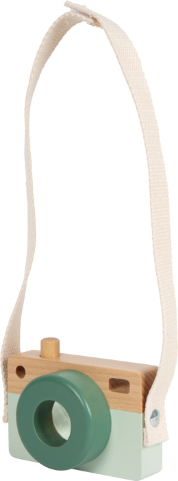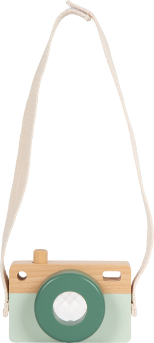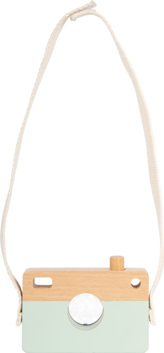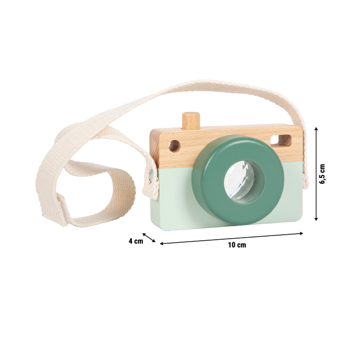 Die Kamera aus Holz ist hochwertig und kindgerecht. Das „Objektiv“ besteht aus einem Kaleidoskop, durch das kleine Fotografinnen oder Fotografen beim Durchblicken bunte Muster und verzerrte Bilder entdecken können.
