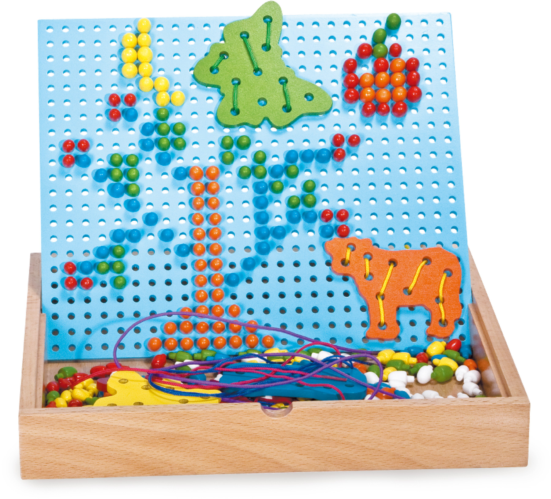 Dieses Spiel ist eine Kombination aus Steck- und Fädelspiel. Mit diesem können Kinder immer wieder neue Materialkombinationen ausprobieren. 5 Elemente (z.B. Schmetterling, Teddybär, Tier) lässen sich mit bunten Fäden annähen. Die verschiedenfarbigen Stecker bieten die optimale Ergänzung für ein buntes Bild. Hier ist Geschicklichkeit und Kreativität gefragt. Vor allem wird die Auge-Hand-Koordination gefördert.