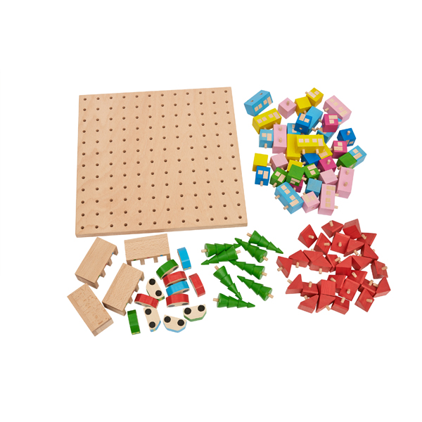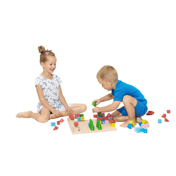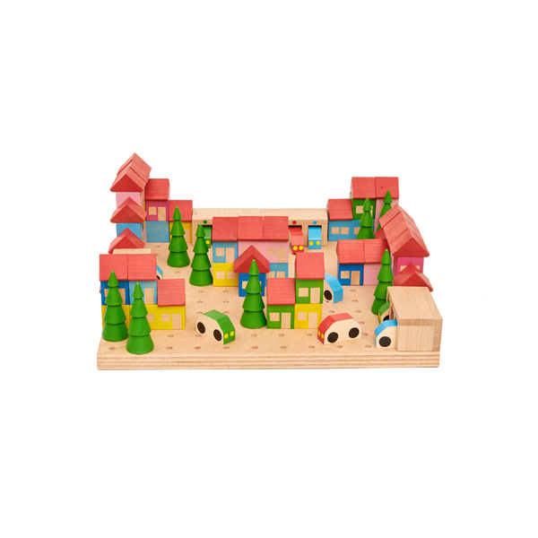 Ein- oder mehrgeschossige Häuser und Bäume haben Zapfen, mit denen sie sich zusammen- bzw. in die Löcher der Grundplatte stecken lassen. Garagen können frei dazwischen platziert werden - und die Autos sind mobil, um durch die Stadt cruisen und in die farblich passenden Garagen einzuparken.