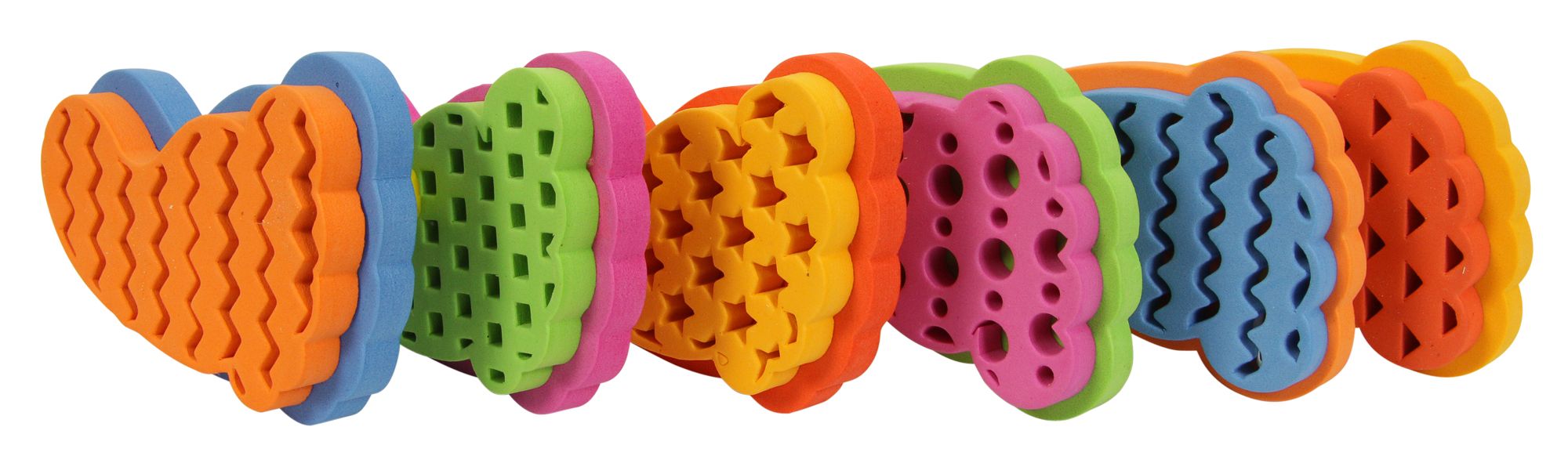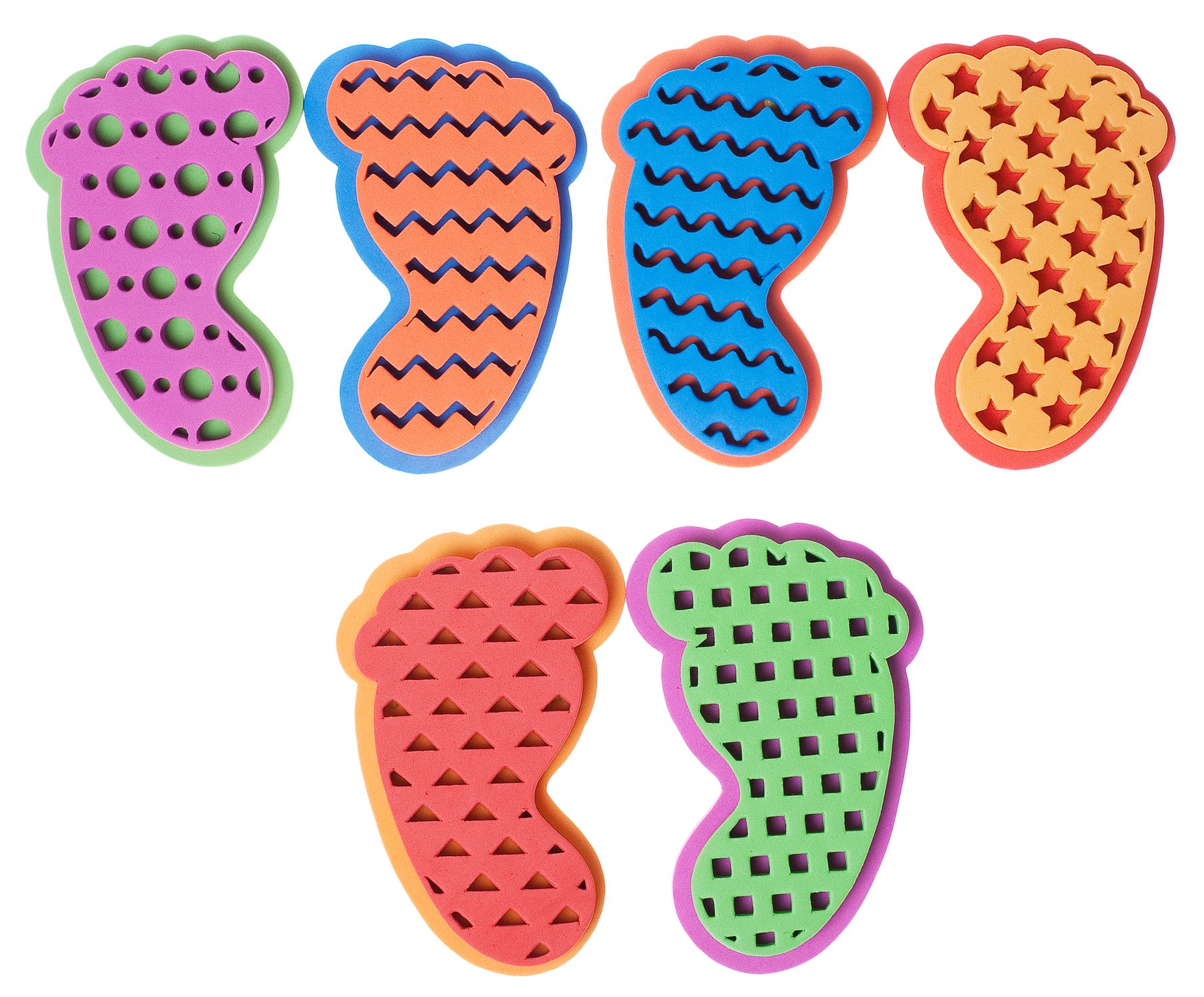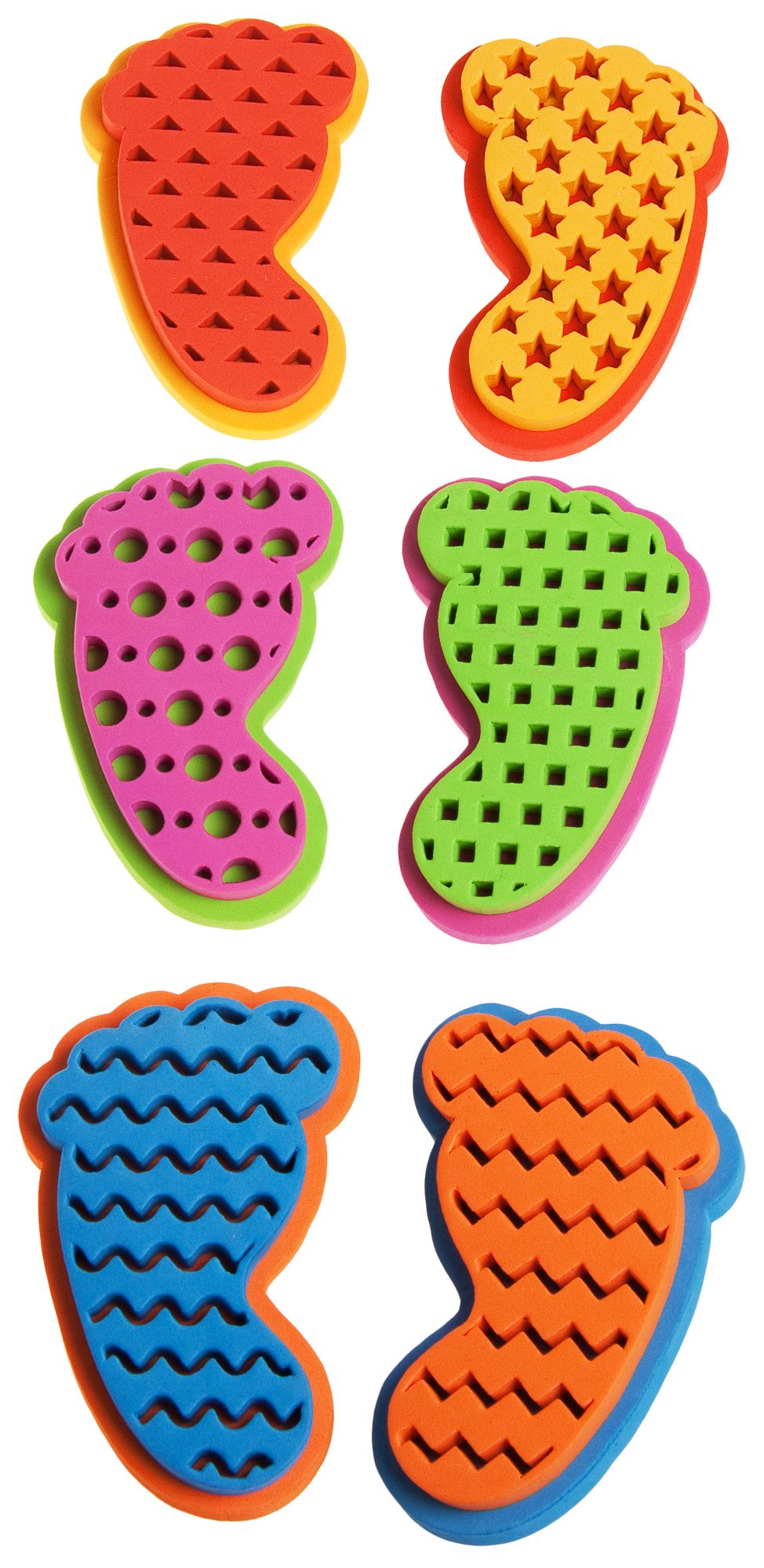 Mit diesen ausgefallenen Moosgummistempeln in Form kleiner Zehensandalen kannst du lustige Fußspuren mit tollen Mustern abstempeln. Gestalte damit zum Beispiel deine eigene Kinderzimmertapete.