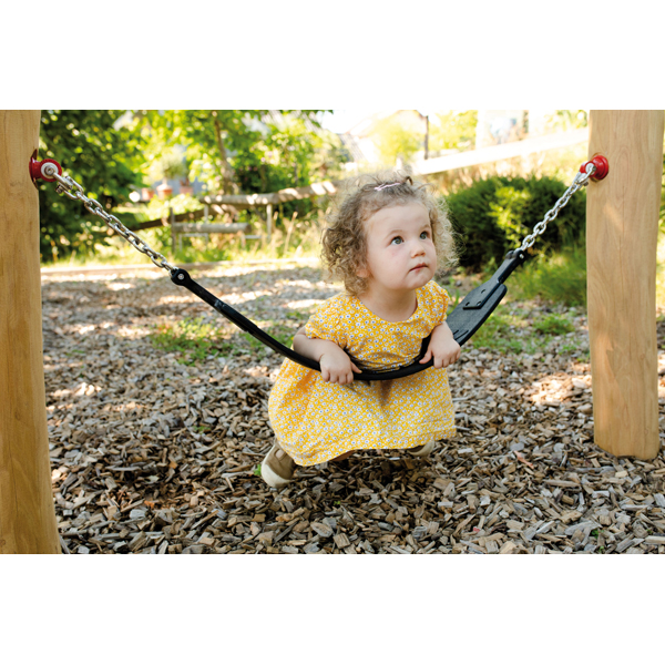 - 1 Gurtschaukelsitz, 2 Ketten aus Edelstahl Ø 6 mm, 2 Gelenkschaukelhaken, Schäkel, Halbmondbuchsen.