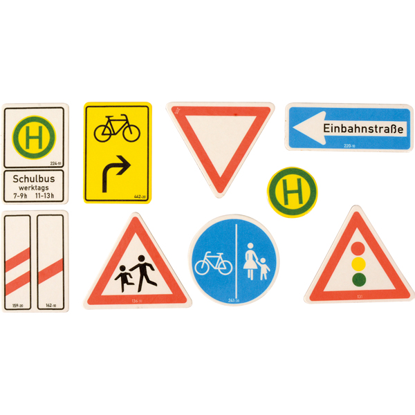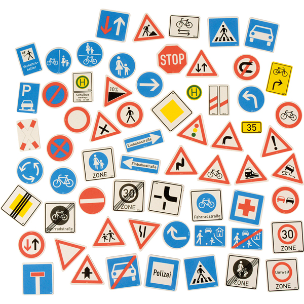 Schilder zur Verkehrserziehung... Mit den magnetischen Verkehrszeichen können Kinder die Bedeutung und richtige Verhaltensweisen im Straßenverkehr kennen lernen: Wie verhalte ich mich auf dem Weg zur Schule oder als Radfahrer. Auf einer Whiteboardtafel können beispielsweise Straßen, Häuser, Zebrastreifen zur Veranschaulichung aufgemalt werden. Inkl. Anleitung/Erklärung.