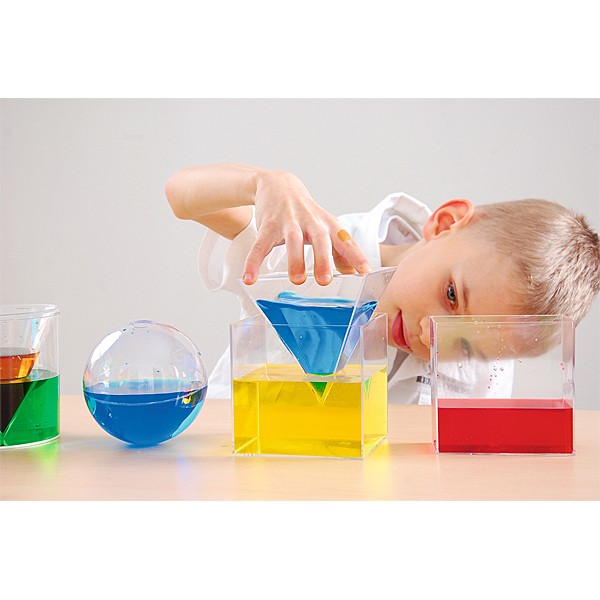 • 6 transparente Behälter: Zylinder, Kugel, Pyramide, Quader, Kegel, Würfel