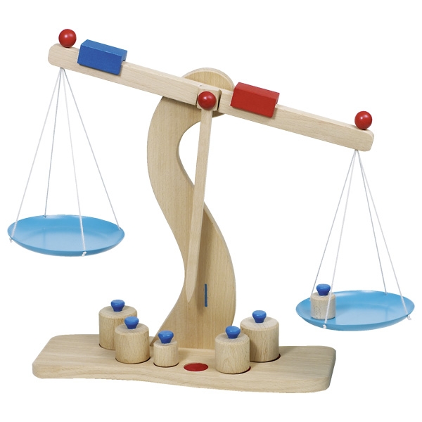 Mit Hilfe der Waage können Kinder z.B. die Produkte des Marktstandes oder des Kaufmannsladens abgewogen werden. Mit Metallschalen.