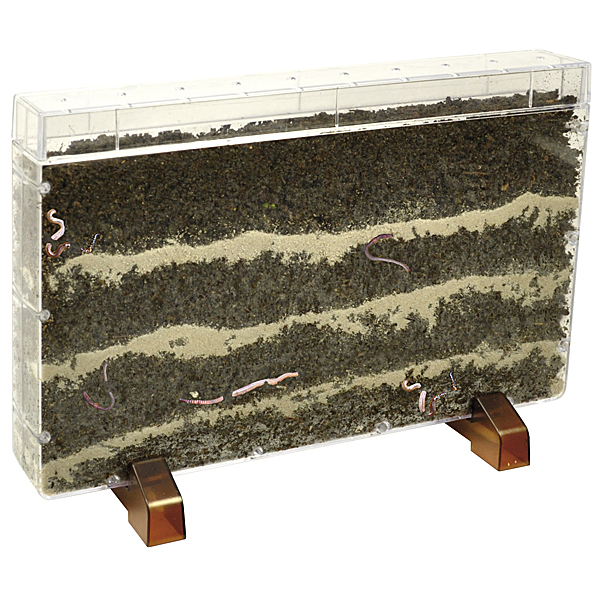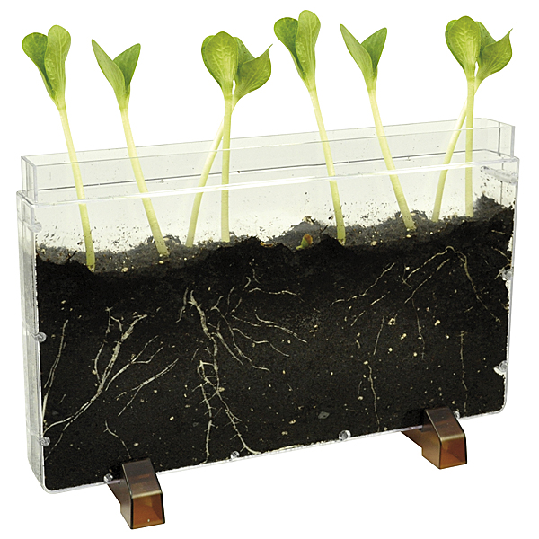 Kinder mit diesem Experiment beobachten: wie Wurzeln sprießen oder Würmer sich ihren Weg suchen und dabei den Boden durchlüften. Einfach die Behausung mit Erde füllen, Samen (z. B. Bohnen) oder Würmer (aus dem Kompost) hinzugeben und, ganz wichtig, mit Lichtschutzcover abdunkeln. Nur im Dunkeln kommen die Wurzeln und Wurmgänge bis an die innere Kunststoffwand. Das Schutzcover wird nur zur Beobachtung abgenommen.